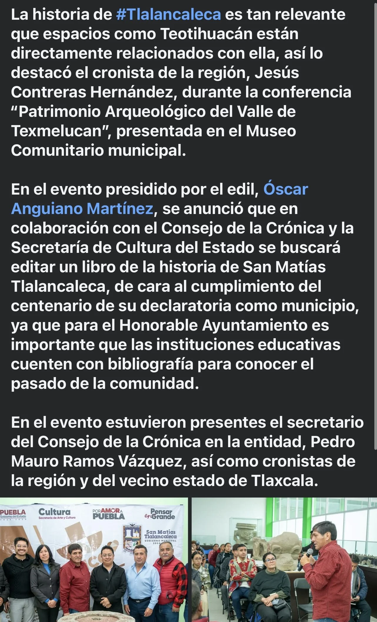 The history of #Tlalancaleca is so significant that sites such as Teotihuacán are directly connected to it, as highlighted by the regional chronicler, Jesús Contreras Hernández, during the conference “Archaeological Heritage of the Valley of Texmelucan,” presented at the Municipal Community Museum.